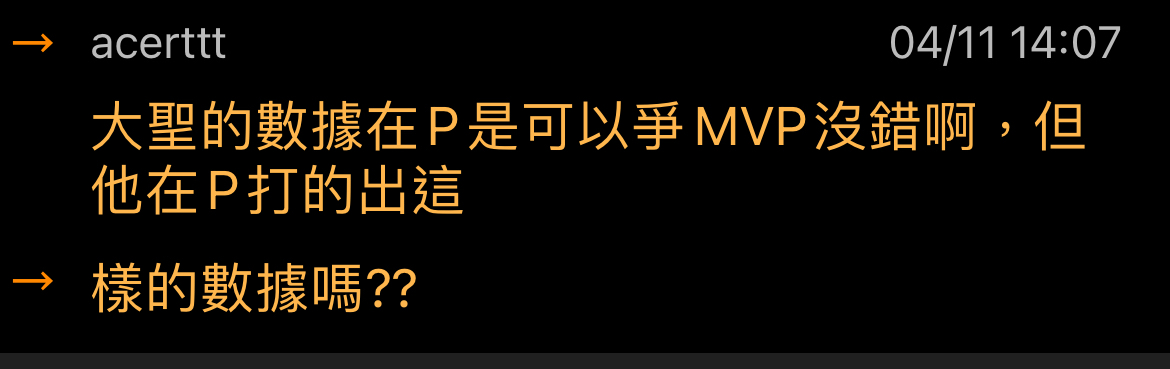 → acerttt : 大聖的數據在P也可以爭MVP(這叫數據),大聖個人因為 04/11 14:20