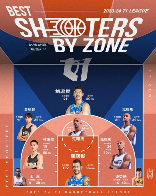 由全主場紀錄台精準統計每一個出手數據,找出各區域最多進球數的砍分好手!帶你解析