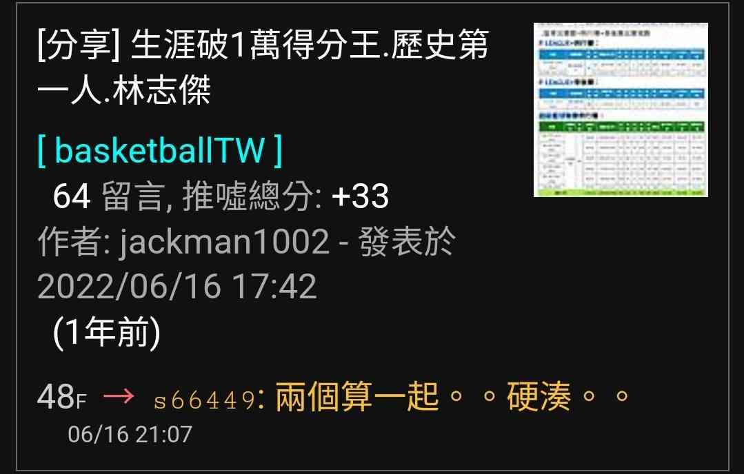 推 s66449 : 那魔獸和林書豪的個人紀錄可以NBA+職籃算在一起嗎? 04/29 10:11