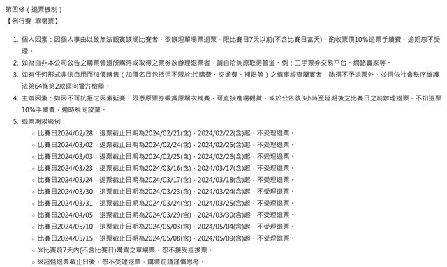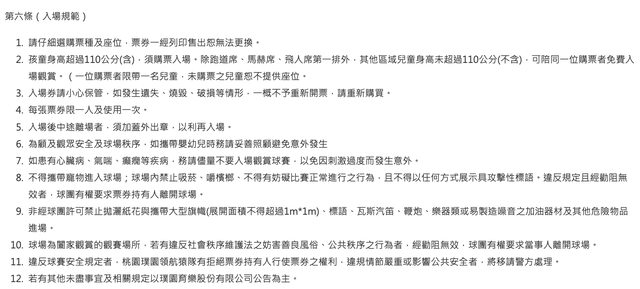 各球團均已依「運動賽事票券定型化契約應記載及不得記載事項」規定,改正完竣在案。