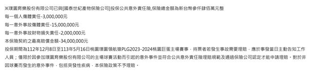 領航猿主場已公告之保險,已符合上列規定(日期:2023/12/8~2024/5/16)