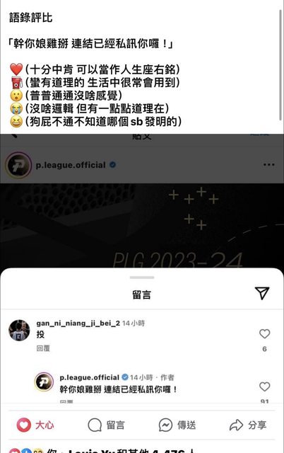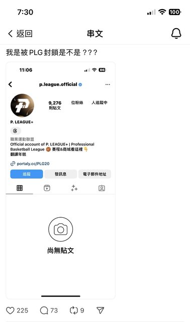 更一下 本文好像被刪了 不過解封了 附上後續連結: https://www.threads.net/@jiayu.0125/post/C6fggBWr4CF 剛在threads看到 一個夢想家球迷分享IG被PLG封鎖 https://i.imgur.com/QPvWOW5.png