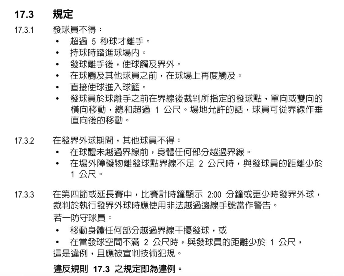 → bobwalkerkao: 條 當界外第一位球員可處理球時開始計算5秒 阿飛在 05/12 21:16