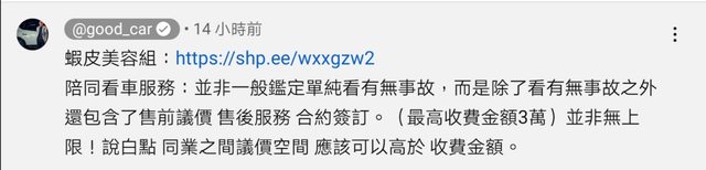 → g7063068 : 這種對車價高的有市場啊,花個三萬就有行內的幫看外 09/06 12:03