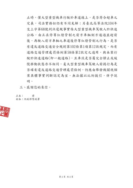 此公文為本人詢問警政署,警政署函文給交通部路政司,路政司再函文給我及警政署