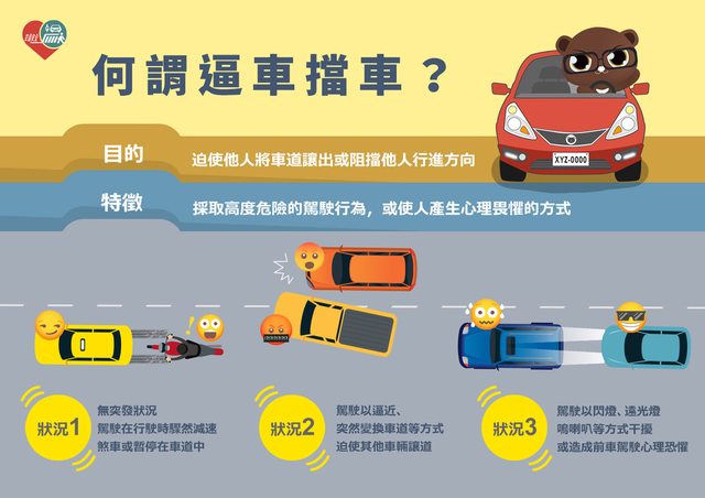 常見的逼車行為通常是以迫近、驟然變換車道或其他不當方式迫使他車讓道,或是非遇突發