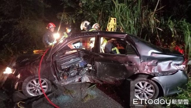 谷關分隊長張凱閔說,車輛強力撞擊車體從中凹陷,駕駛被卡在駕駛座上,兩名友人順利脫