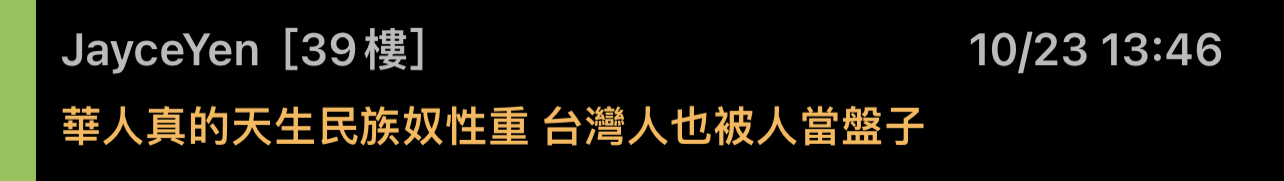 推 JayceYen : 華人真的天生民族奴性重 台灣人也被人當盤子 10/23 13:46