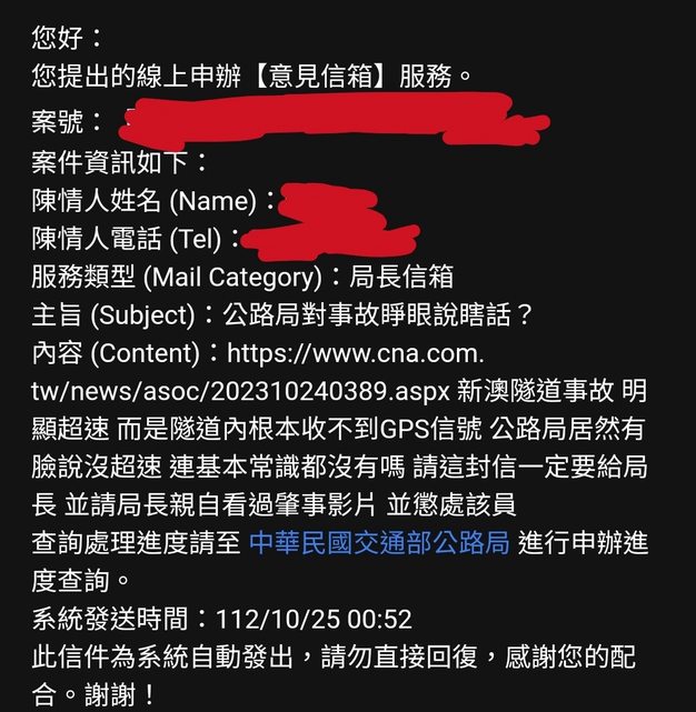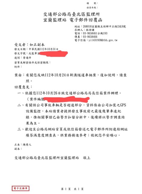 : 公路局指出,車輛懷疑有超速行駛部分,經調閱該車GPS速度紀錄,車輛於隧道內行駛速
