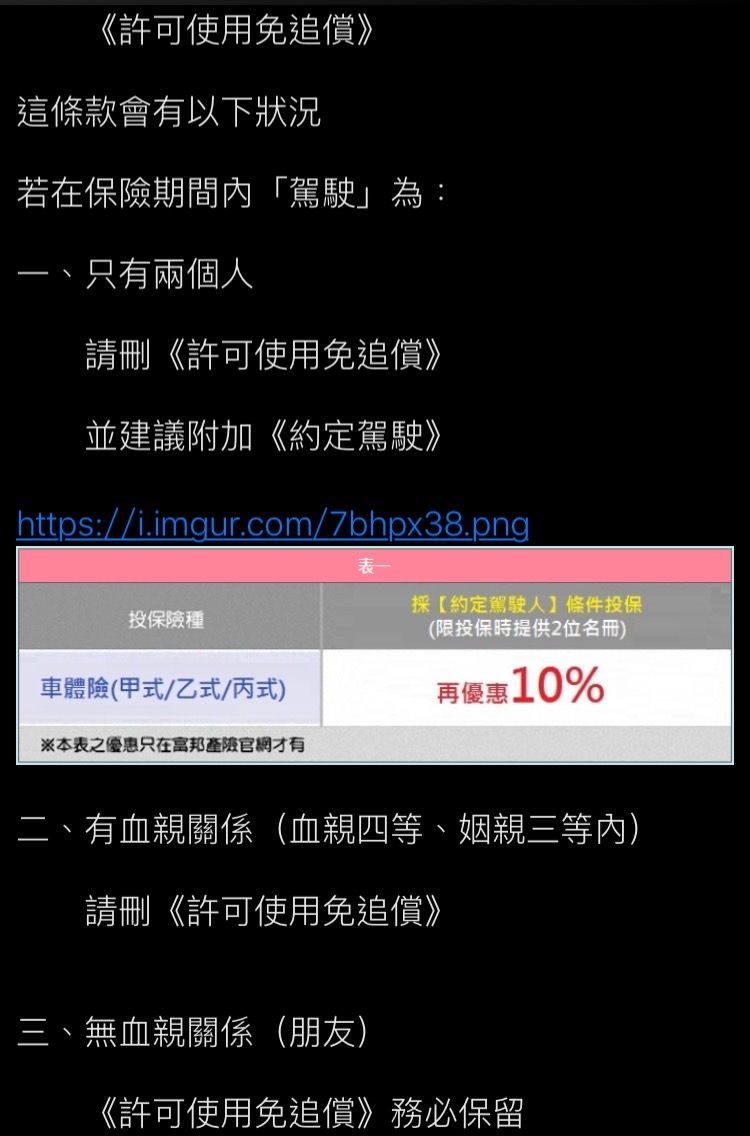 → TurtleGods : 然後免追償,四等親內自帶免追償,除非借朋友,不 11/14 21:15