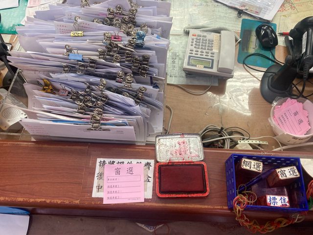),就交給承辦窗口(免取號),他確認完會把每份資料夾成一疊,放在旁邊籃子排隊。