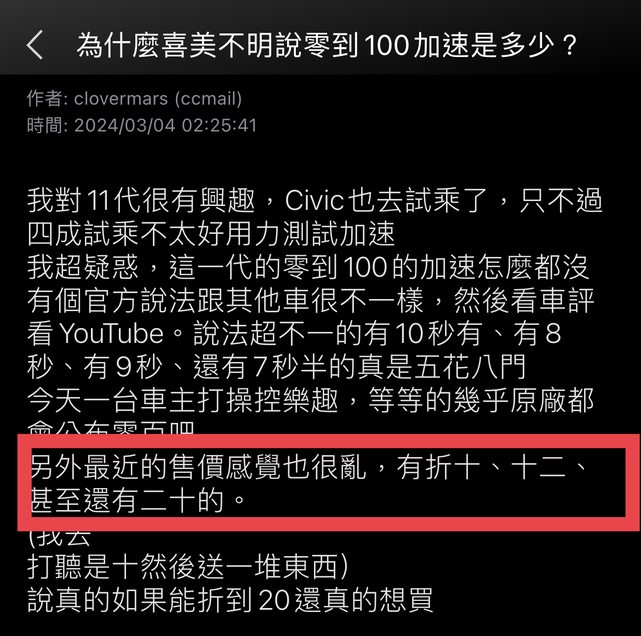 → griffon569 : Civic的加速一定比Prius慢,不過車子不是只看加速度03/04 04:21