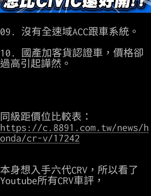 噓 liko7676 : 不要CRV 除非你有缺黃油、三星桿?或是你需要信仰 03/08 18:59