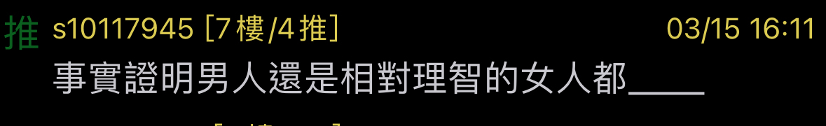 推 s10117945 : 事實證明男人還是相對理智的女人都____ 03/15 16:11