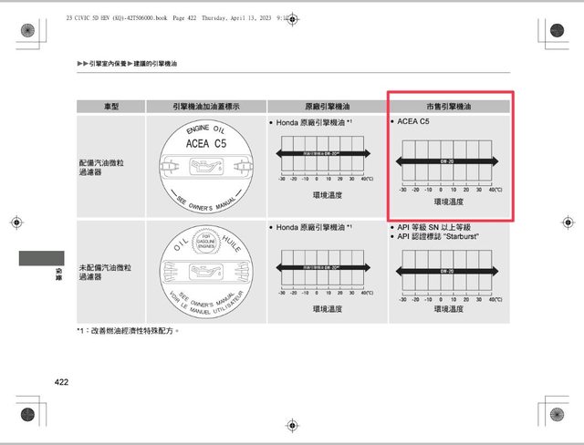 註:手冊建議使用需具ACEA C5規範的0W20機油。