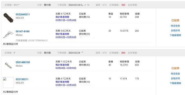 安全值,分別10顆接頭和20顆及40顆端子,合計NTD1,330。交期部分這次比較快,2/23訂