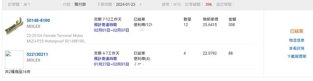 金額部分,當時買了4顆接頭跟12顆端子,合計NTD396。跟其他幾間大間的供應商比起來