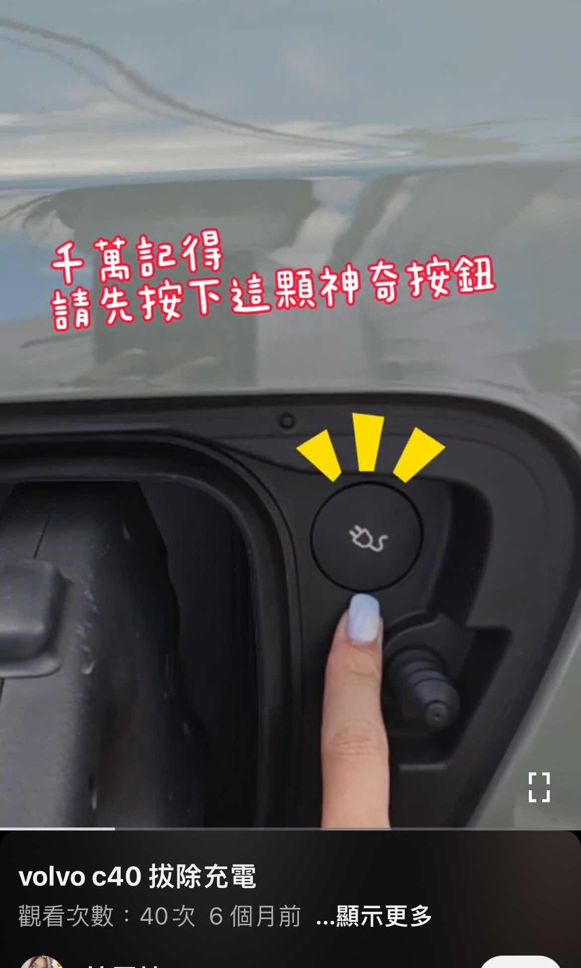 → H2 : Volvo C40 Re 到充電孔的確有一個圓形解鎖的 03/23 22:20