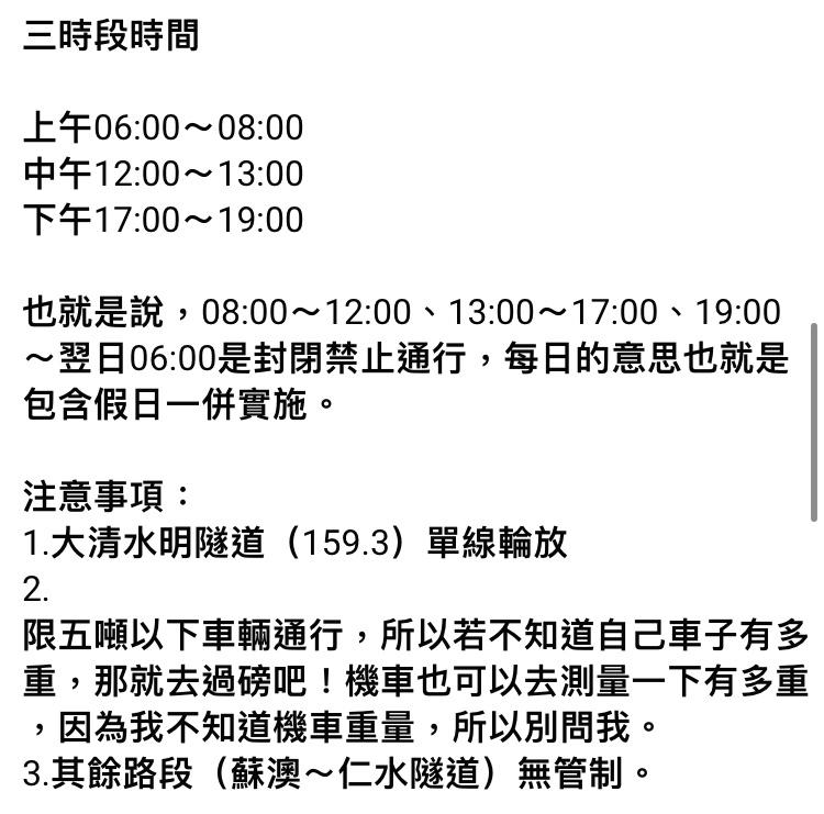 推 hero3: 大清水隧道出口好像1天開放三個時間通行,上午7點中午12點 04/19 12:58