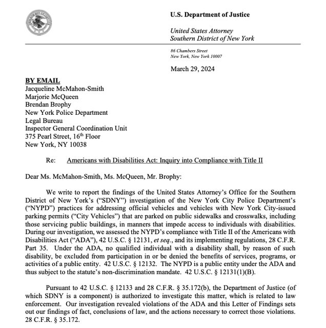 司法部威脅紐約警察局就人行道停車提起訴訟