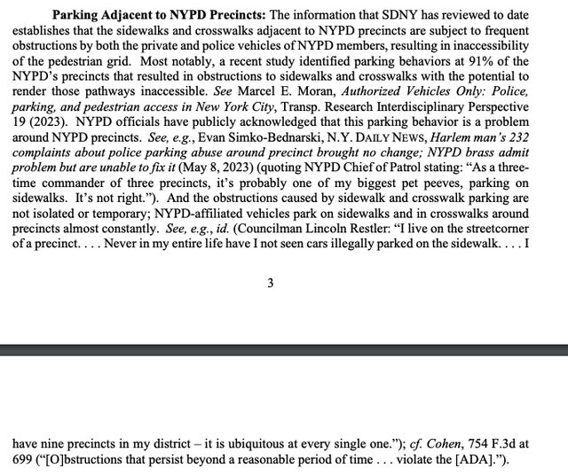 此外,人行道和斑馬線停車造成的阻塞並非孤立或暫時的;與紐約警察局有關的車輛幾乎