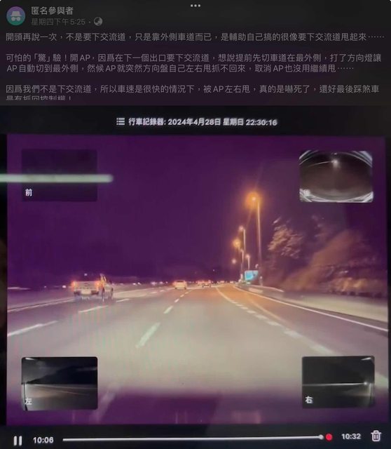 → mn3258: 問題在於車主是搶方向盤解除AP,這個操作在高速公路上很 05/04 16:51