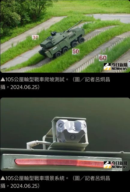 [NOWnews今日新聞] 國防部3月送交立院書面報告指出,軍備局生產製造中心研製的105公厘輪型戰車,去年已完成初期作戰測評,後續規劃建案量產。目前軍備局209廠已完成2輛105公厘輪型戰車樣車,360度環景系統列為標準配備,引擎馬力提升至600匹,後續研發將依軍種需求將車身高度將至3公尺以下,預計民國114年(2025年)完成研製。