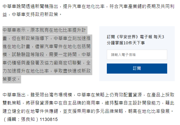 : : 中華汽車對於新制表態支持,為了將加速與其他產業合作,加速旗下汽車零件開模、組裝