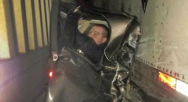 : : 警消人員到場後,先請吊車將聯結車移開,再使用破壞器材協助轎車駕駛脫困,但駕駛已