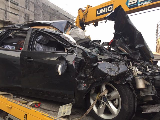 : : 夾,轎車瞬間被夾成鐵餅,完全看不出車型,駕駛受困其中。警消獲報到場,緊急出動破