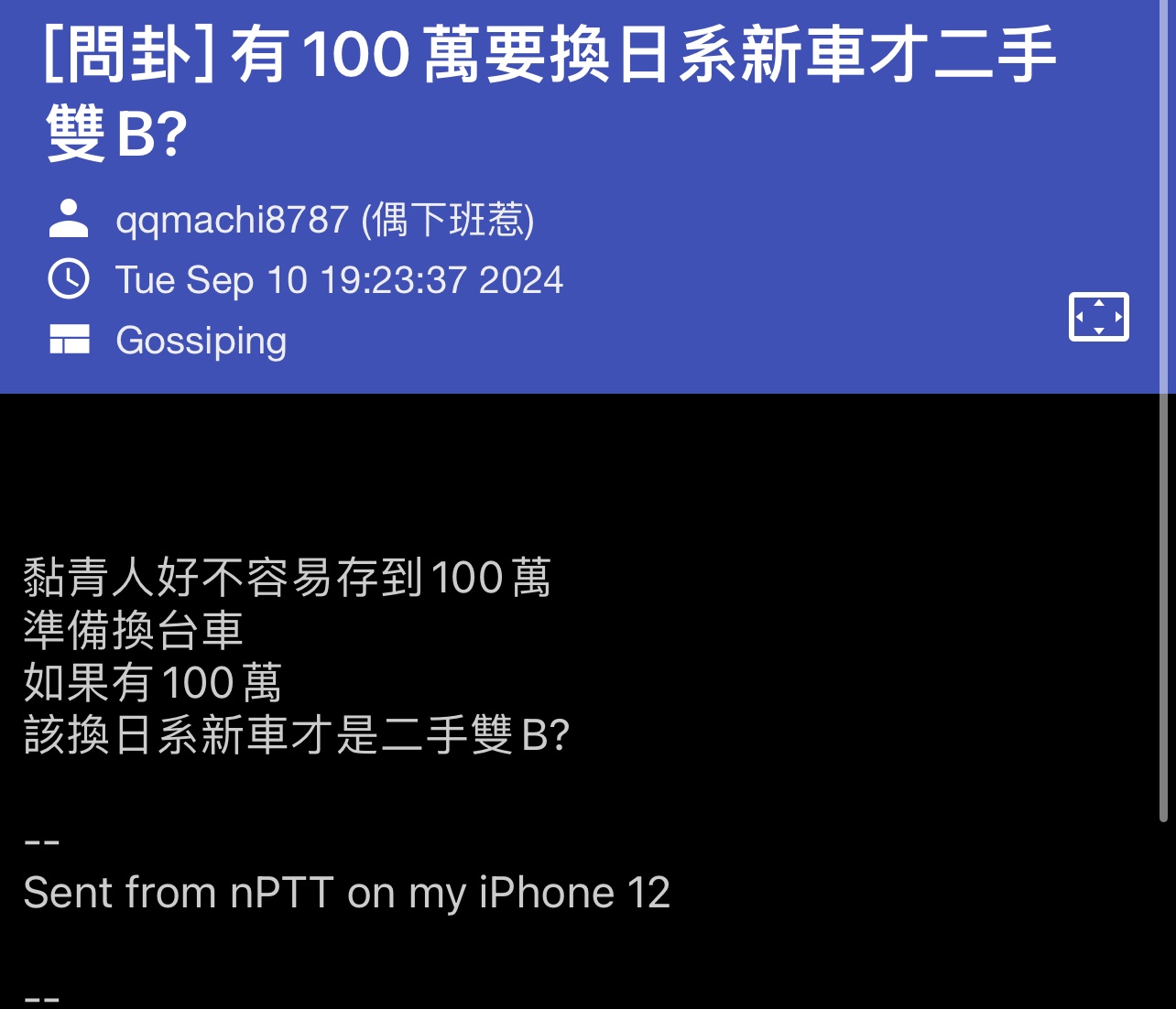 BlacKlonely: 車版只會推買百萬神A什麼百萬馬之達會被笑 09/10 23:42