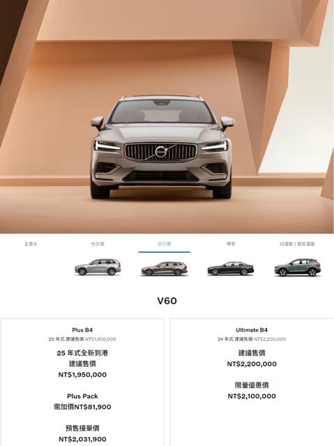 在旅行車V60車系上也有調整,過去185萬的Plus B3車型將取消,新增195萬的Plus B4車