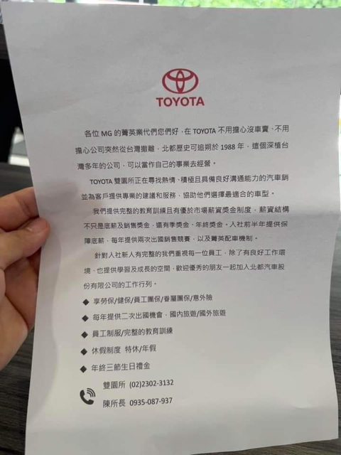 推 u9912114: 上週去NISSAN看車,跟業代聊天才剛講到MG業務在跳船... 09/20 22:49