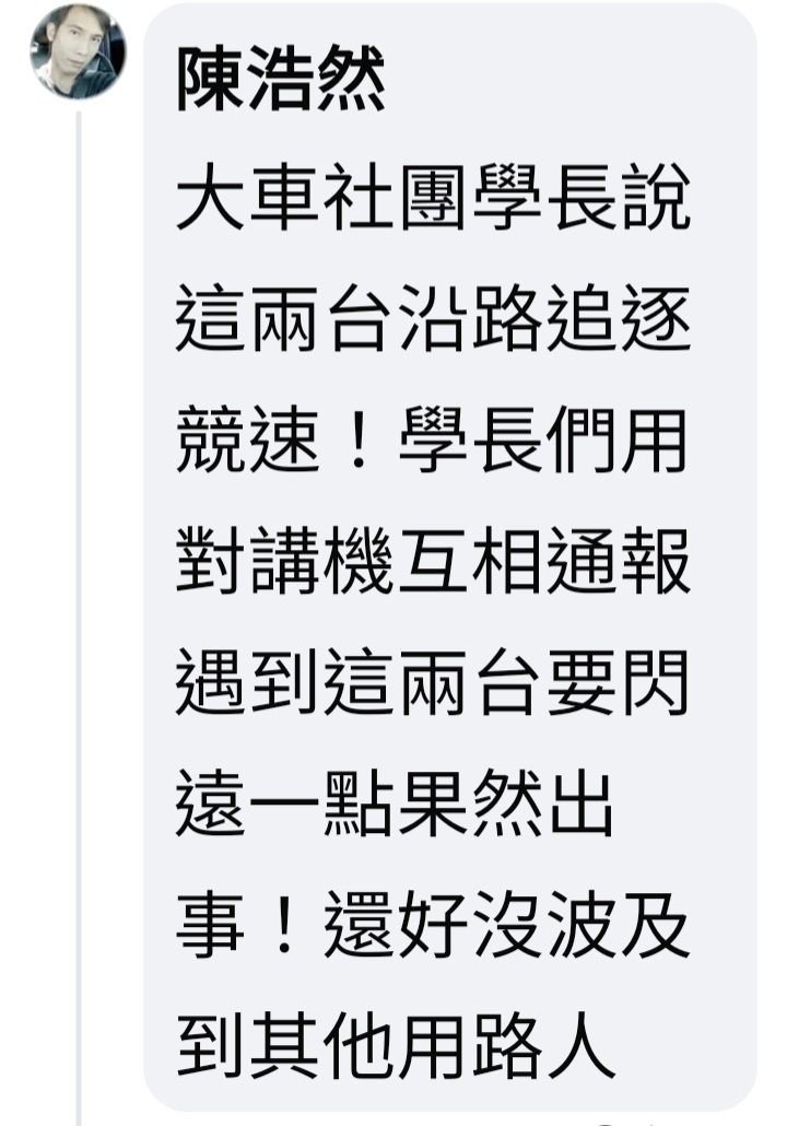 推 OldWang911: fb有人說是兩台車互相競速。真實狀況還是要等警方公 09/24 09:12