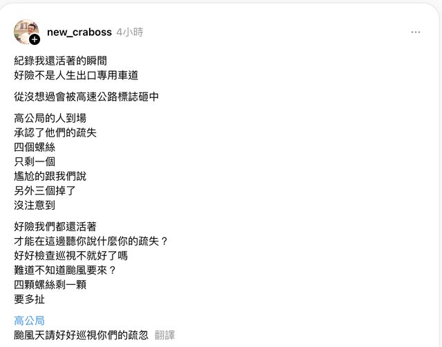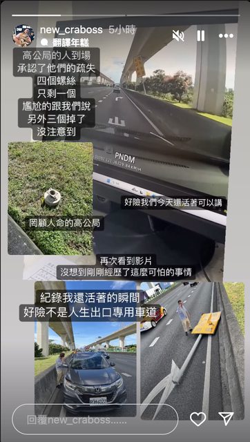 高公局的人到場,承認了他們的疏失,四個螺絲只剩一個,尷尬的跟我們說