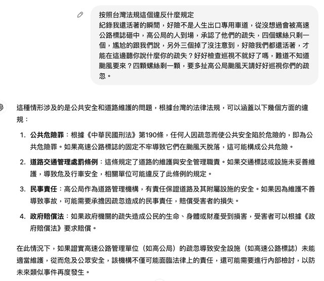3. 民事責任:高公局作為道路管理機構,有責任保證道路及其附屬設施的安全。如果因為維