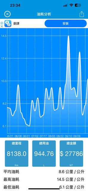於是油耗直接從一開始的6、7、8 到現在穩定 8、9、10 甚至穩定一點開可以到13
