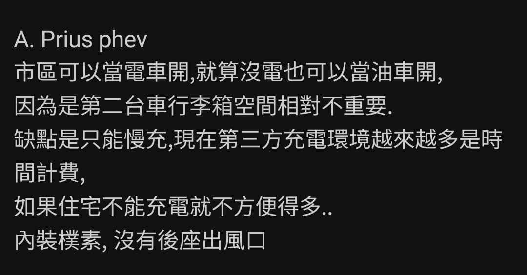 推 jazzprozac: 要考慮一下之後空間,注意台灣進的PRIUS 是PHEV不是HE 06/12 00:51