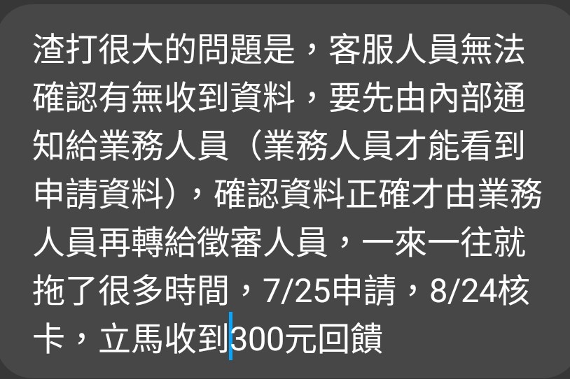 噓 s999132 : 辦個卡一個半月無聲無息 說兩句就變刁民? 08/24 14:37