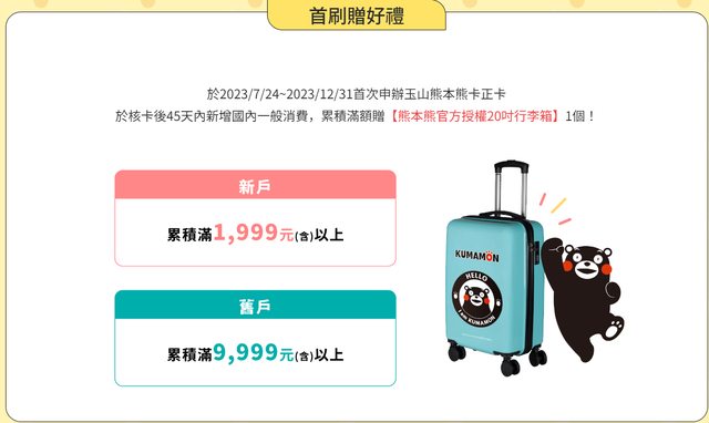 推 becky1997 : 永豐JCB首刷禮條件跟其他相同,送20吋行李箱(缺貨 09/09 01:22