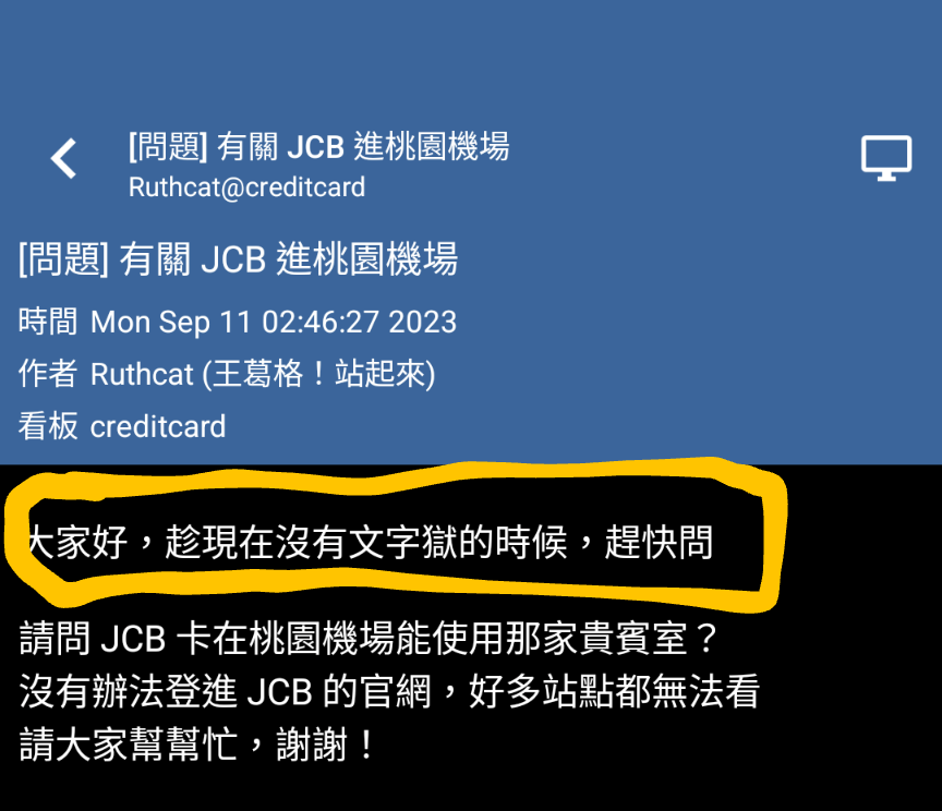 大家好,趁現在沒有文字獄的時候,趕快問 請問 JCB 卡在桃園機場能使用那家貴賓室? 沒有辦法登進 JCB 的官網,好多站點都無法看 請大家幫幫忙,謝謝! --      歡迎官臨 Ruthcat 的貓貓窩http://Ruthcat.pixnet.net/album      (念 "官" 時,嘴巴要壓的扁扁的,這樣才有 "ㄙㄨㄥˊ" 到哦~~  ^_^b  ) 新增粉絲頁,大家來合購 m^_^m https://www.facebook.com/pages/如思貓的喵咪窩/1611589469055053 (請將上面網址,連中文及後面數字,全部複製到網址列貼上) -- ※ 發信站: 批踢踢實業坊(ptt-web.org.tw), 來自: 114.26.78.181 (臺灣) ※ 文章網址: https://ptt-web.org.tw/creditcard/M.1694371590.A.0DA