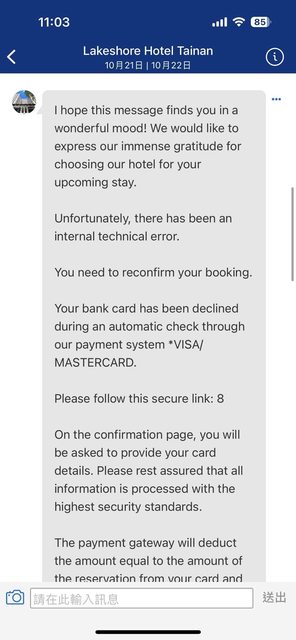 推 Woyun99 : 最近訂Booking有收到類似訊息,求證飯店確認是詐騙 09/27 15:31