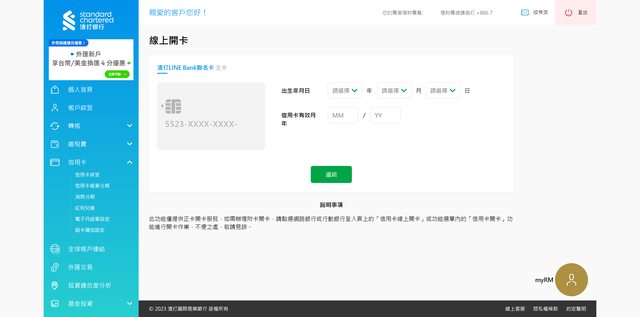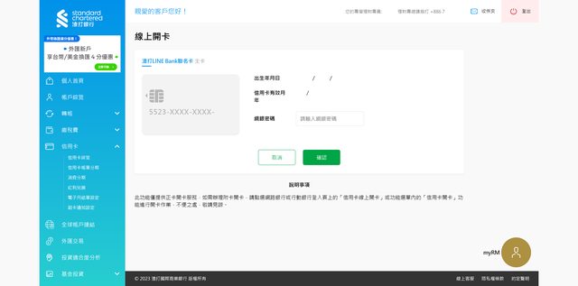 我之後會打去客服修改英文姓名,因為卡片上印「姓,名 名」,但原本兩張渣打卡都是 「姓, 名 名」,正確的寫法逗點, 和名之間要再加一個空格,它少打了空格,我先修改 姓名,但請它等卡片到期續卡時再寄正確姓名的新卡給我就好,這次不需要重製卡片。 2023/09/25 網路銀行線上開卡》 第一步:https://i.imgur.com/67wZZks.png