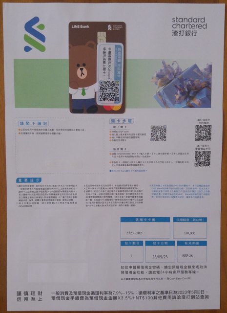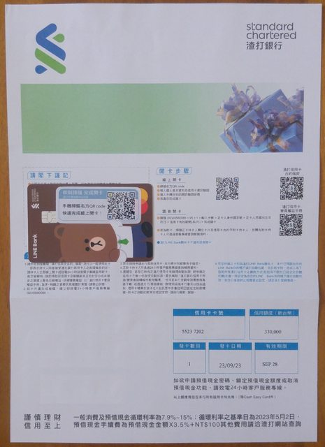 (再經過一晚系統整理,回歸共用額度,渣打LINE Bank聯名卡也放到最前面的位置) 渣打LINE Bank聯名卡開箱》 2023/09/25 上午收到掛號 信封 正面:https://i.imgur.com/MVuSj7r.png