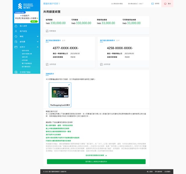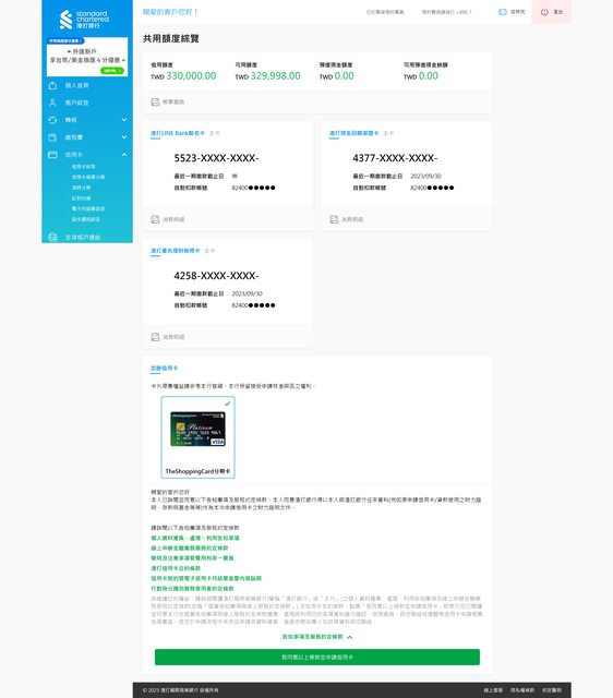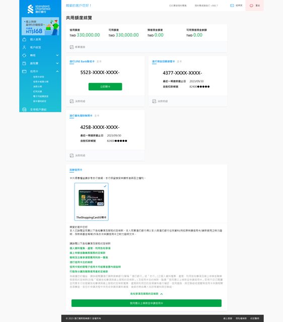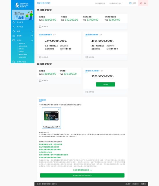 (112/09/20 渣打銀行 徵信作業中心以「新業務申請」查詢信用資料) 真的再次感謝我的理專,這次(第三張渣打信用卡)也是靠理專出手才順利核卡,總結 我的三次渣打信用卡申辦經驗,都是靠理專幫忙才得以成功。 網路銀行信用卡綜覽資訊》 2023/09/21:https://i.imgur.com/etERs6P.png