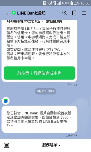 (LINE Bank帳戶自動扣款首次設定活動加碼回饋金額$300) LINE Bank主帳戶 09/21 行銷活動現金回饋 300:https://i.imgur.com/ZcCPuCW.png