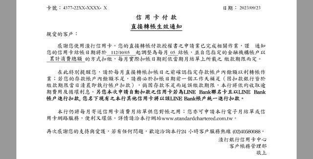 (新卡的自動扣款帳號出現了) 補充》 2023/09/23 渣打寄的電子郵件通知:https://i.imgur.com/lWT4SSN.png