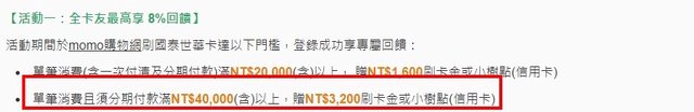 推 jht37 : 1、單筆消費達某金額就是一次就要刷到該金額,而不 11/03 03:18