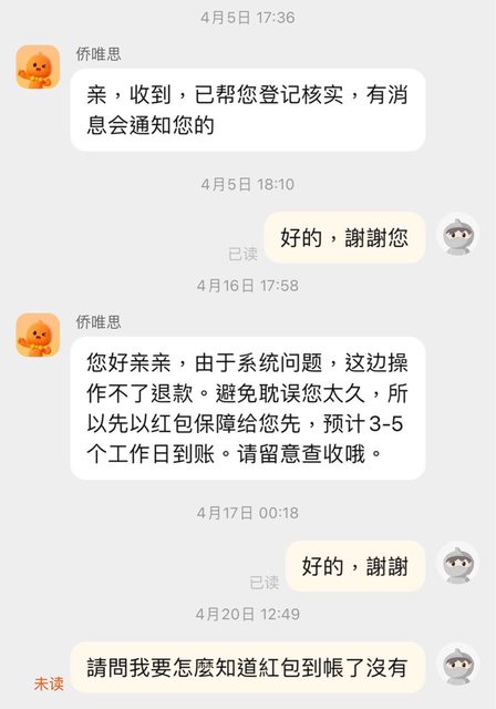 → skyway0828: 該店有天貓標誌,我反覆檢查我的紅包 111.82.208.248 05/09 01:19