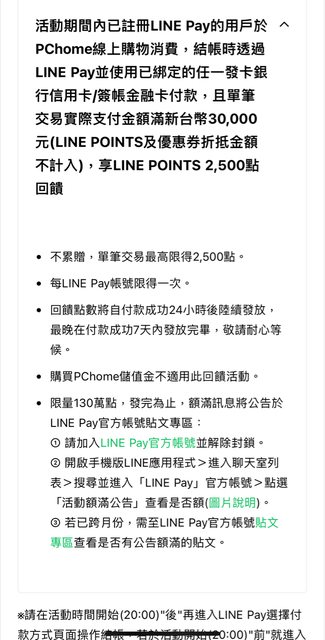 → pikachulai: LINEPAY官帳有額滿公告可以查 210.71.217.243 05/08 20:13